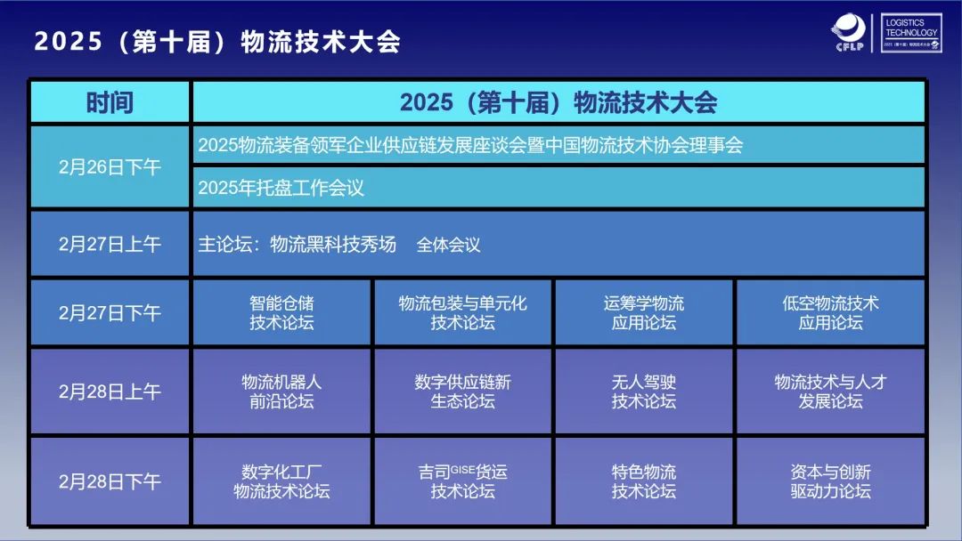 十年创新路,探索破局新路径 物流技术大会至今,已经历经九个春秋。当下,AI技术浪潮扑面而来,“人工智能+现代物流”按下快进键,物流大模型纷至沓来。从物流无人车、自动驾驶卡车,再到无人机物流配送,“无人物流”商业化应用突飞猛进。2025年,是物流技术大会的第十届,也是创新破局的关键之年。 本届物流技术大会将由”物流黑科技秀场“主论坛以及十二场专业论坛组成。主论坛“物流黑科技秀场”将围绕黑科技如何全面提升物流的效率与能力,为行业的高质量发展注入新动能,为物流及供应链变革提供技术支撑进行深度探讨,为不同物流场景提升价值创造能力。十二个专业论坛将涵盖智能仓储技术、物流包装与单元化技术、运筹学物流应用、低空物流技术应用、物流机器人前沿、数字供应链新生态、无人驾驶技术、物流技术与人才发展、数字化工厂物流技术、吉司GISE货运技术、特色物流技术以及资本与创新驱动力等热点话题。汇聚行业精英,共同探索物流行业的发展方向和未来蓝图,2025(第十届)物流技术大会致力于为物流技术装备企业搭建共创、共享、共融平台。